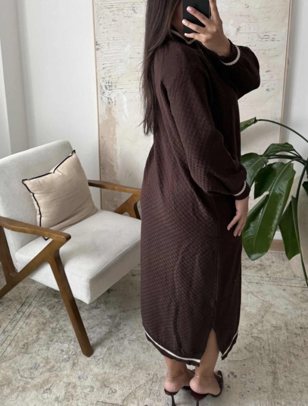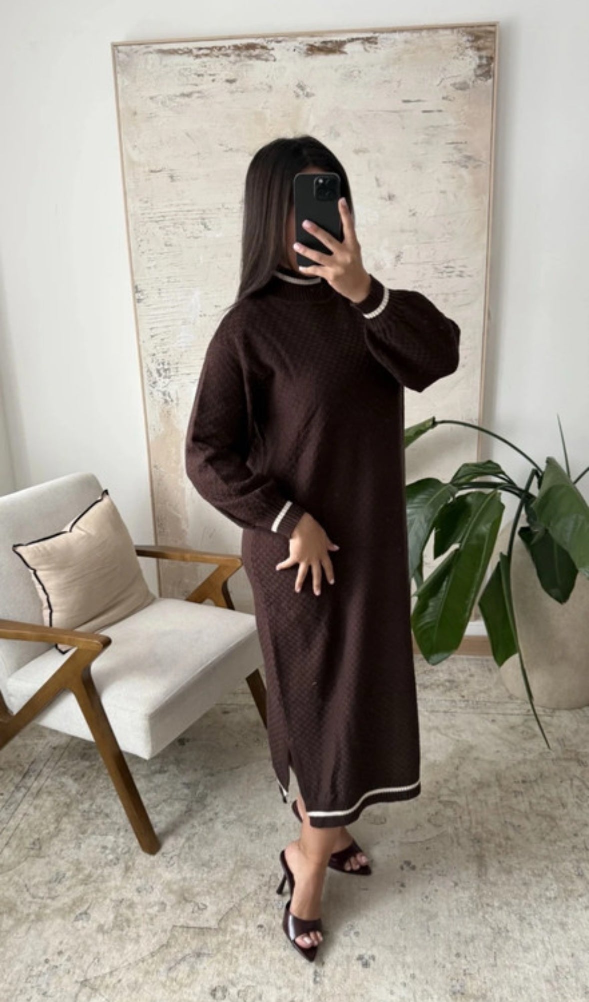 Elegante lange jurk met een stijlvolle geribde hoge hals, lange mouwen die mooi aansluiten bij de polsen en verfijnde contrasterende details langs de halslijn en zoom. Een tijdloos ontwerp dat comfort en elegantie combineert.